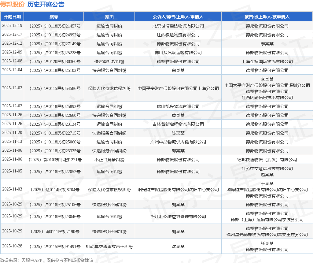 依据计算,近一年内以德邦物流股份有限公司为当事人的前史开庭公告有388则,其间案由为“快递服务合同胶葛”的公告以125则居首,其次为“运送合同胶葛”有78则,“劳作争议”有27则。前史开庭公告(前20条)如下: